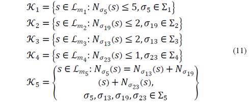 En efecto, los eventos σ1, σ7, σ15, σ17, σ21 y σ25 son 1-interacciones: σ1, σ7, y σ17, representan los comienzos de las actividades de dispersión ejecutadas por PB1, PC1 y MA1 respectivamente, mientras que, los eventos σ15, σ21, y σ25 representan las completaciones de las actividades de mezclado y envasado llevadas acabos por la unidades PC4, MA2, y EN respectivamente. Por otro lado, los eventos σ3, σ5, σ9, σ11 y σ23 son 2-interacciones: σ3 representa la completación y el comienzo de las actividades de dispersión y mezclado por parte PB1 y PB2, σ5 representa la completación de mezclado por parte PB2 y el comienzo de disponibilidad del recurso Re, σ9 representa la completación de la actividad dispersión llevada a cabo por la unidad PC1 y el comienzo de la actividad molienda llevada a cabo por la unidad PC2, σ11 representa la completación de actividad de molienda llevada a cabo por la unidad PC2 y el comienzo de la actividad de mezclado del concentrado de color llevado a cabo por la unidad PC3 y σ23 representa la finalización del uso de la base blanca por PC y el comienzo de la actividad de envasado de la pintura blanca. Finalmente, los eventos σ13 y σ19 son 3-interacciones: σ13 representa la completación de la actividad de mezclado de concentrado de color llevado a cabo por la unidad PC3, la finalización del uso de la base blanca por MA y el comienzo de la actividad de mezclado del concentrado de color con la base incolora llevada a cabo por la unidad PC4 y σ19 representa la finalización del uso de la base blanca por PC, la completación de la actividad de dispersión llevada a cabo por la unidad MA1 y el comienzo de la actividad mezclado llevada a cabo por la unidad MA2.