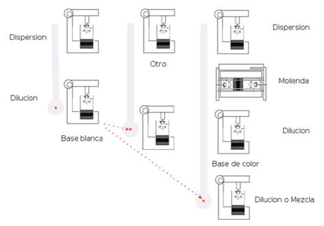 Para el mezclado del empaste con resinas y solventes (concentrado de color llevado a cabo por la unidad PC3) representando los estatus y