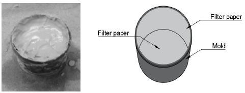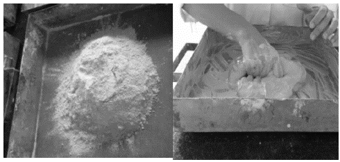 Figure 1: Sample preparation procedure: making the Kaolin clay slurry at 1.5 times the liquid limit. Left) Dried Kaolin powder. Right) Kaolin clay slurry after its hydration.