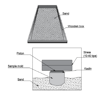 For the consolidation process, a special cylindrical mold to place the sample is used with dimensions of about 10 cm of diameter and 10 cm of height. Some filter papers cover the inner walls of the mold to assure an inner homogenous drainage of the sample during its initial consolidation process. After this, a certain amount of slurry is placed within the cylindrical mold, see Fig. 2. During the consolidation stage, a vertical load is applied on the top boundary of the sample while it drains through the bottom boundary. In order to guarantee a uniform bottom drainage, a box with compacted dry sand is placed underneath the sample, see Fig. 3a. The sand box has dimensions of 2.2 m long times 1.2 m width. The sand layer is properly compacted and horizontally levelled to produce a flat and rigid draining surface at the bottom of the sample. A high compaction effort helped to avoid significant settlement of the sand during the sample loading.