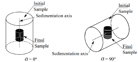 After their initial consolidation, samples received their final geometry with a special trimming device for clays shown in Fig. 5. Considering that the final sample diameter depends on the test to perform (e.g. unconfined compression, direct shear test, etc), different top plates compatible with the trimming device were produced with a 3D printer. The top plate of the trimming device (see Fig. 5 left)) was designed with the software SolidWorks and printed with a hard polymer. Two kind of samples were trimmed: samples with vertical sedimentation axes, hereafter identified with its sedimentation angle α = 0°, and samples with horizontal sedimentation axes, i.e. α = 90°. There is a schematic illustration of the trimming procedure to obtain the two different sedimentation axes in Fig. 6. With their final geometry, samples of Kaolin clay are proved to quantify the influence of the sedimentation angle on different properties, such as permeability and strain-stress characteristics. Next section describes the conducted experimental procedures and their results.