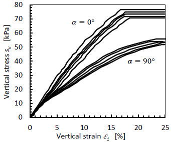 The next experiments correspond to unconfined compression tests. A total number of 10 samples are sheared, five of them having vertical sedimentation axis α = 0° and the others with horizontal sedimentation axis α = 90° The number of samples for each sedimentation angle allows us to evaluate the experiment reproducibility. The sample diameter was set to 6 cm and its height to 6 cm. The environmental humidity was under control to conserve samples under saturated conditions before shearing. Considering that all samples were prepared under the same conditions, they all had the same initial void ratio. All samples are sheared until reaching a vertical strain of about 25%. Fig. 7 shows the results of the unconfined compression tests show that they are qualitatively well reproducible. The experimental curves indicate that samples with horizontal sedimentation axis are softer than the others, i.e. the Young’s modulus (for loading) E of samples with horizontal sedimentation angle 𝛼=90° are lower than those with vertical sedimentation angle α = 0°. The resulting ratio of the Young’s modulus E between samples with horizontal and vertical sedimentation axes, E (α = 90°) and E (α = 0°) respectively, ranges between E (α = 90°)/ E (α = 0°) = {0.6 to 0.8} Similarly, the ratio of unconfined shear strengths between samples with horizontal and vertical sedimentation axes ranges between S u (α = 90°)/ S u (α = 0°) = {0.6 to 0.8}. Table 4 summarizes the results of the unconfined compression tests.