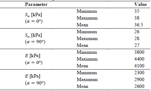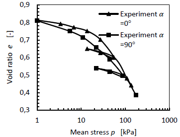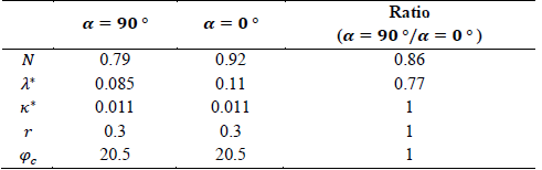 Two sets of material parameters passed calibration for samples with horizontal and vertical sedimentation axes respectively. Upon the calibration procedure, it has been detected, that while parameters λ*, N depend on the soil sedimentation axis, k* φc and r seem to be constant and independent on the material inherent anisotropy. The fact that the critical state friction angle φc remains constant, is in agreement with some other authors e.g. [30].The calibrated parameters are listed in Table 6. Notice that the ratio of λ* (=0.77) is within the range obtained for the Young modulus from unconfined compression tests (=0.6-0.8), see section 3.