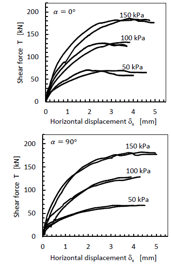 Figure 9: Direct shear test results. Top) Samples with vertical sedimentation angle α = 0°. Bottom) Samples with horizontal sedimentation angle α = 90°.