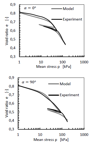 Figure 10: Simulation of oedometric tests with Kaolin clay. Top) samples with vertical sedimentation axis α = 0°. Bottom) samples with horizontal sedimentation axis α = 90°.