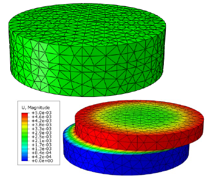 , are scalar factors, N is the non-linear stiffness (second order tensor) and ζ is the linear stiffness (fourth order tensor). Deduction and analysis of the constitutive is in [1] and [29], but is out of the scope of the present article. The model requires the calibration of five material parameters: and r. A brief description of their calibration procedure is given in Appendix 8.2 and their names, approximate range and some useful experiments for their calibration are listed in Table 5. The constitutive model has been implemented in a Fortran subroutine UMAT compatible with the commercial software Abaqus Standard. Implemented is an explicit integration scheme with substepping algorithm in which a very small substepping size has been selected to assure numerical convergence. The material subroutine is previously tested in many simulations and showed agreement with other reported simulations, e.g. [1] and [29].