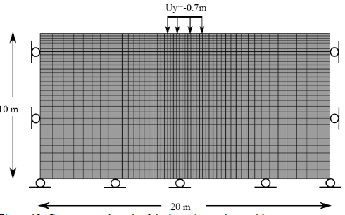 Finally, the influence of the inherent anisotropy is analyzed in a Boundary Value Problem (BVP). The problem simulates a rigid strip foundation with a width of 1 m supported by the ground surface. This analysis considers 2D finite elements under plane strain conditions. Fig 13 shows the dimension and mesh of the BVP. We assumed that the soil is dry, and therefore drained conditions under static analysis. For the sake of simplicity, the strip foundation load is simulated with the application of a vertical displacement of -0.7 m. The resulting reaction force below the foundation is analyzed to compute the ultimate bearing capacity. The BVP is repeated twice, one with parameters for vertical sedimentation axis α = 0° and the second for horizontal sedimentation axis α = 90°.