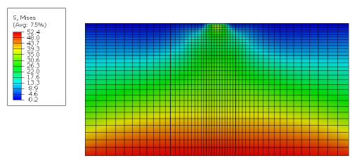 = 15 kN/m3 is considered. Initial horizontal stresses are computed with a lateral earth coefficient of K0 = 0.65. The initial void ratio are computed following the Butterfield relation for normal consolidation line log((1 + e)) =N-λ*log (p * F) with parameters for α = 0° and assuming a factor of F=1.5. The latter factor 𝐹 has been computed as an approximation to reproduce the behavior of a normally consolidated clay under oedometric (and not isotropic) conditions. Horizontal displacements are restrained at the lateral boundaries while vertical displacements are restrained at the bottom boundary. Fig. 14 shows an example of the final contours of the deviator stress .