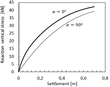 Fig. 15 shows simulated results. The plot shows the resulting reaction vertical stress against the settlement. The result resembles the conclusions from the unconfined compression test and direct shear test, in which an initial softer behavior of the soil with horizontal sedimentation axis exists. There exists some discrepancies at the maximum reaction vertical force. This suggests that the ultimate bearing capacity of the soil depends on the inherent anisotropy.