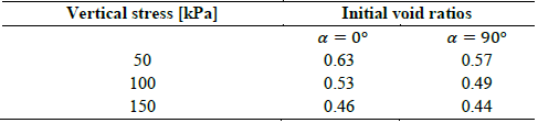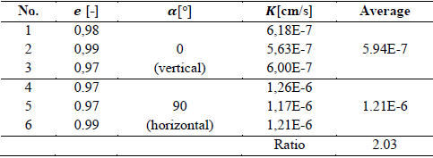 The first corresponds to the permeability test. They were variable head permeability tests considering the low permeability of the Kaolin clay. Samples within the permeameter with a height of 3 cm were flooded with distilled water during two days to guarantee its complete saturation. After this procedure, samples with horizontal α = 90° and vertical α = 0° sedimentation axes were tested. Table 3 shows the results of the permeability. All results showed that samples having a horizontal sedimentation axis α = 90° present a higher permeability than the ones with vertical sedimentation axes α = 0°. The average permeability ratio K (α = 90°)/K(α = 0°) is equal to 2.03. Similar results are in [2-4].