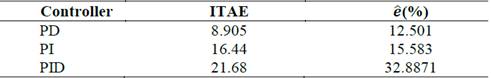 Error metrics were used to evaluate controller performance by means of: ITAE and relative error, related in equations (13) and (14). Table 5 shows the comparison of the results for each controller. It is seen that for both performance parameters the controller PD had the best performance.