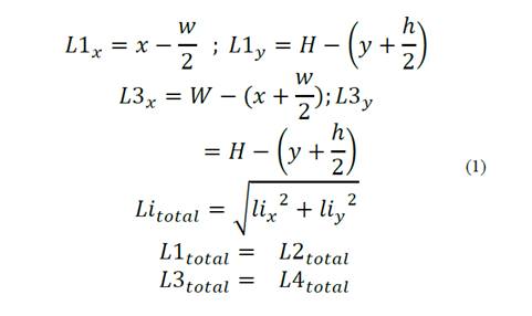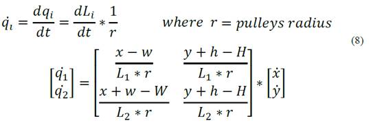Geometric relationships are found between the length of the cables (L1, L2, L3 and L4) and the position of the end effector as shown in the equations found at (1):