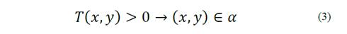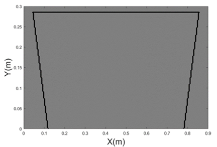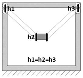In cable driven parallel robots, the work space is limited, not only by the dimensions of the frame, but also by the tension present in each of the cables in a given instant [3]. Therefore, the workspace area of a CDPR is defined by the space within the frame whose Cartesian coordinates ensure that the tension has a positive value in all of its cables. If α is defined as the set of the points that belong to the workspace, Equation (3) summarizes this definition in the following expression: