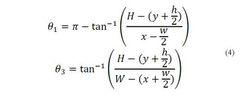 By means of geometric relations, the values for the angles of the tensions can be expressed as in Equation (4).