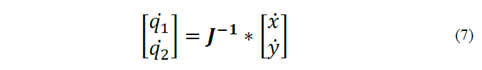 Starting from the equations (1) and (2) that describe the inverse kinematics, they can be derived in time and using eq.(7), the inverse Jacobian matrix is defined as shown in (8).