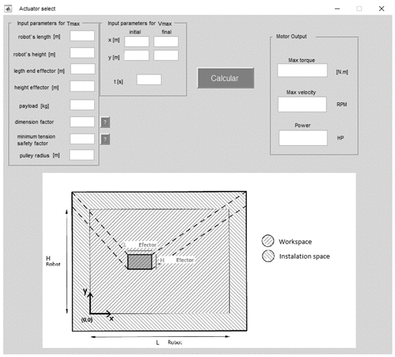Based on the mathematical models explained in the previous section, aiming to develop a parametric system, a program was developed in order to select the actuators required for the construction of any CDPR with the mentioned architecture (planar suspended). Specifying needs of space and load of the robot, the interface also needs the following parameters as entrees for the calculus: