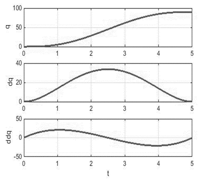 In order to restrict actuator accelerations and speeds in all points of the trajectory, high order polynomial trajectories were selected [17]. From these trajectories, physical restrictions, precision criteria and softness were then contemplated [8]. Otherwise, "in the polynomial trajectories the degree of the polynomial depends on the number of conditions to be satisfied as well as of the smoothness in the resulting movement" [18] fifth-order trajectories were implemented, like those shown in Fig. 16.