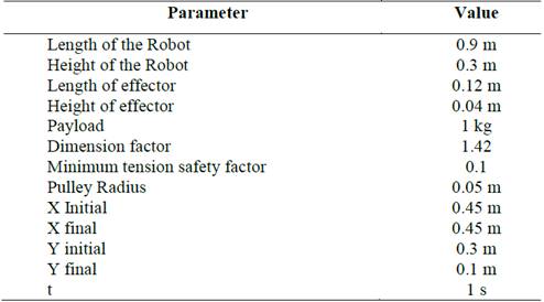 Minimum tension safety Factor: Percentage of the mass equal to the minimum tension of the robot. This factor guaranties that the tension in the cables is never equal to zero or negative values; therefore, the robot never loses orientation of the end effector.