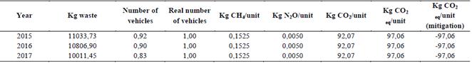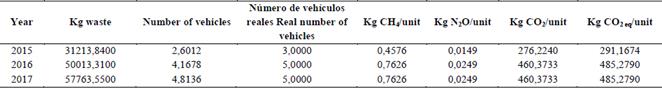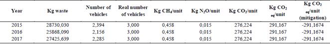 Vehicular Natural Gas during the transport of material from the ITM Robledo to landfill. In Table 3, the emissions of the different GHGs and the Carbon Footprint (KgCO2 eq) are shown.