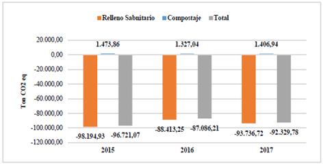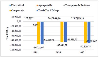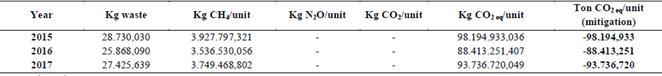 Because it is not disposed of in landfill and due to its biological degradation inside the final disposal tanks, organic waste does not generate GHGs. Therefore, as shown in Table 5, GHGs that are no longer emitted by this waste are subject to a harnessing process through composting.