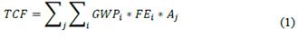 Where TCF is the Total Carbon Footprint in Kg CO2eq, GWPi is the Global Warming Potential or the conversion factor, for the GHG i to Kg CO2eq, FEi is the GHG i Emission Factor of the Activity or Resource j and Aj is the factor of the total consumption of the resource or service studied.
