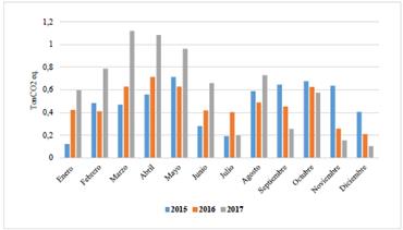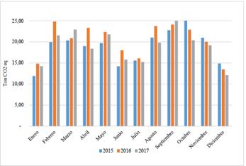 In Fig. 8, the Carbon Footprint (TonCO2 eq) associated with the consumption of electricity is shown, month to month, for the years studied.