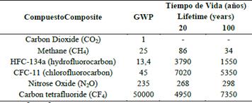 Table 1: Global warming potential factors of different GHG to Kg of CO2 equivalents.