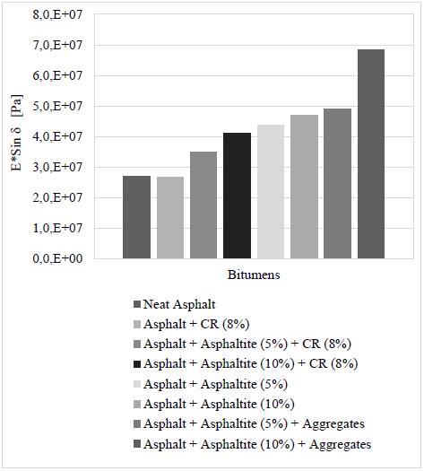 Doing an analogy with the Superpave design system created in the Strategic Highway Research Program (SHRP), in where the value of G*sin δ is used to analyze the performance of the asphalt considering factors as the climate, the value of E* sin δ was evaluated at a reference temperature of 22°C in order to observe the predisposition of the asphalt mixtures to the fatigue cracking. The product of the complex shear modulus G* and the sine of the phase angle is used in the method Superpave to design the asphalt binders in order to control the fatigue of the material. Low values resulting of the product of G*sen δ are considered to be optimal looking for a greater resistance to the cracking by fatigue [21]. In this light and before the notable increase of the complex modulus in the majority of the studied bitumens, it is decided to make the analysis of the samples presented in Fig. 3. It is shown that the increase of the complex modulus of the bitumens results in an increase of E*sen δ, which means that it has a negative impact in the resistance to the cracking of the material. The mixture of clean Asphalt + Asphaltite (5 and 10 %) + Aggregates showed the major values, whereas the combination of asphalt with CR did not generate significant changes with regard to the neat asphalt. Is it important to notice that, though there is an increase in E*sin δ in the mixtures of asphalt, asphaltite and rubber, the merger of these three components in the same bitumen improve the resistance to the cracking of the pavement in comparison with the mixtures in which was added, to the neat asphalt, asphaltite and aggregates. Thus, by replacing the aggregate for crumb rubber minimizes the possibilities of cracking of the material, which increase at the moment of adding asphaltite.