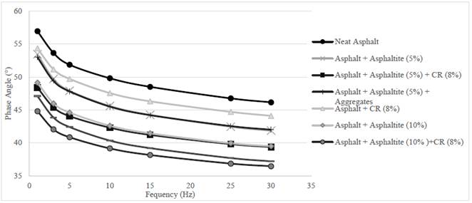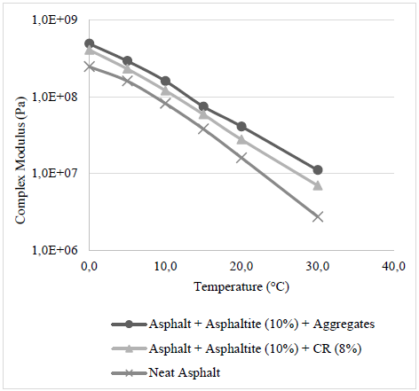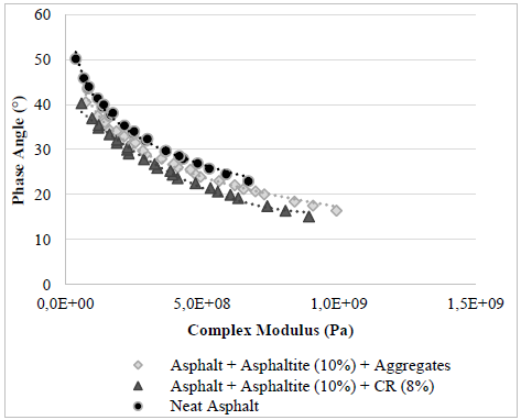 The increase of E* in the whole range of temperatures of both modified mixtures in relation with the neat asphalt is kept uniform and represents an improvement in the stiffness of the asphalt, which means a better resistance before the application of external loads. Although CR's addition diminishes the complex modulus in comparison with the sample in which aggregates were added, it remains greater than the modulus of the neat asphalt. This fact emphasizes the assumption that the incorporation of natural asphalts and recycled crumb rubber to the neat asphalt can be a way of improving the stiffness of the pavement binders.