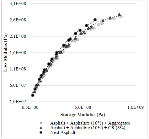The performance of the complex modulus of the asphalt in a complex plane can be assessed in Fig. 5. At high temperatures, the three briquettes display a similar behavior with low elastic response and low Loss Modulus. Albeit a lower elasticity in neat asphalt is perceived.