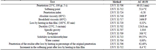 It was used Asphalt Cement (AC) 40-50 acquired from the asphalt plant MPI Ltda. located in the city of Barrancabermeja (Colombia). This material, derived from petroleum, combined with aggregates of various sizes creates the HMA: flexible structures willing to withstand the vehicular traffic. The used bitumen exhibits the characteristics shown in Table 1.