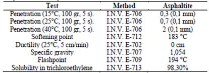In a like manner it was used Asphaltite: the natural bitumen commonly used in modified HMA, which contains high purity hydrocarbons and presents large amount of asphaltenes providing rigidity to the asphalt binder. This material was obtained from a mine in Cesar (Colombia) and was crushed to have particles which pass through sieve N°80. The asphaltite characteristics are shown in Table 2.