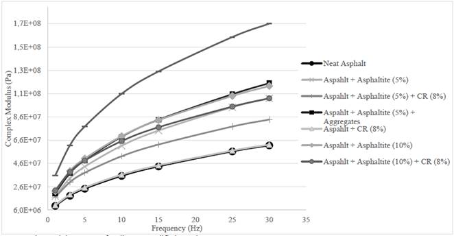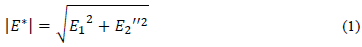 After testing, the complex modulus (E*) of modified asphalts was assessed. This number can be expressed as the absolute value of the root of the sum of the squares of the viscoelastic response of the compound (eq. 1).