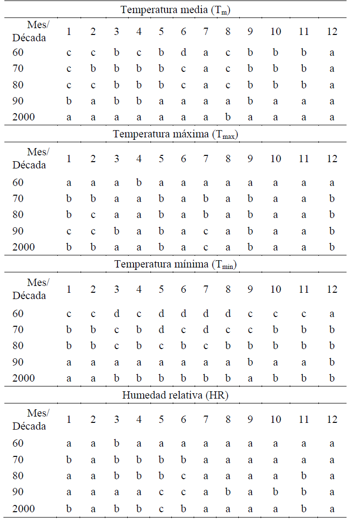 Tabla 4: Comparación por mes de valores medios de las variables climáticas durante las cinco décadas. Letras diferentes en la misma columna indican diferencia estadística significativa p<0.05.