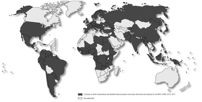 Figure 1: Countries from where reports of low-quality or counterfeit medicines were sent to the WHO between 2013 and 2017 (dark color).