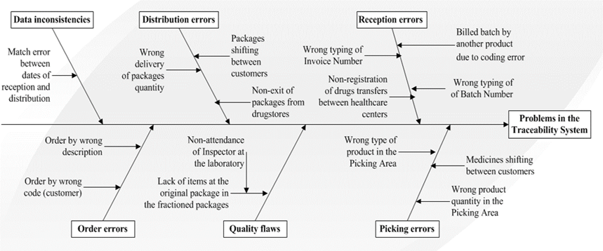 Previous studies carried out in the company using the Inventory Reference Model tool called by its Spanish acronym MRInv [12], have shown the existence of problems in products coding that affect the management of inventories and traceability systems: the results of quality claims, the pretends and real drugs called back from the market, gave evidence of a series of deficiencies that represent failures in the traceability system. All these errors and/or deficiencies can be evidenced in the Ishikawa Diagram shown in Fig. 2.