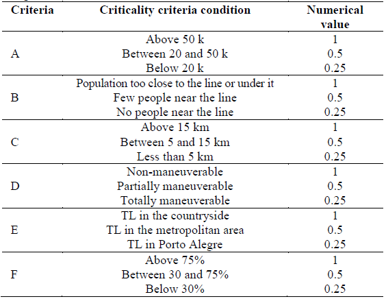 The third step was analyzing the criteria that were mapped in the first step and establishing the criticality of the TL utilizing a method employed by many researchers [7,8,14-16]. The Mudge numerical evaluation of functional relationships was used to define the hierarchy of the criticality criteria, and the evaluation was carried out together with two experts from the area. After the weights of each criterion were defined, the Multi-Attribute Utility Theory (MAUT) technique was used in three TLs under the responsibility of the sector. The lines chosen for the study have different characteristics and importance already known by the experts, making it easier for the study to be approved later. The last part of step three was to present the results of the MAUT to other specialists to confirm if they are representative and consistent with real situations faced by the team.