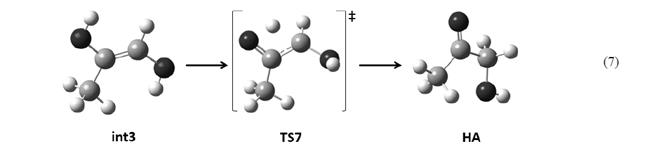 Finally, HA is formed from int3 as the most stable product through a tautomerism reaction as it is shown in eq. ( eq. 7). This reaction has a relatively low energy barrier (ΔG533,TS7 = 154.4 kJ mol-1) suggesting that once the int3 is formed, the conversion to HA at 533 K should be rather easy.