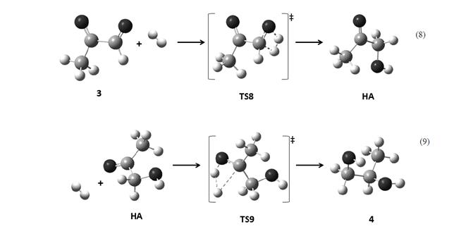 The hydrogenation step that leads to the formation of 1,2-propanediol from HA was also studied. It was found that this reaction also has a high energy barrier (ΔG533,TS9 = 390.8 kJ mol-1) and agrees with the low selectivity obtained for this product in the experimental results. Particularly, for these two hydrogenation reactions similar transition structures were found as can be observed in ( eq. 8), ( eq. 9), i.e. four-membered transition states (TS8 and TS9). These results compared to those obtained for six-membered cyclic transition state would suggest that the energy barrier of the hydrogenation steps depends strongly on the transition state geometry.