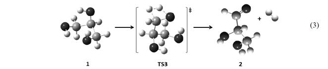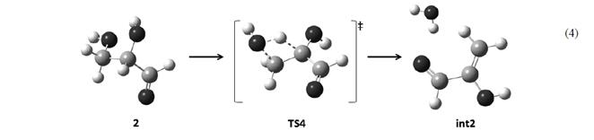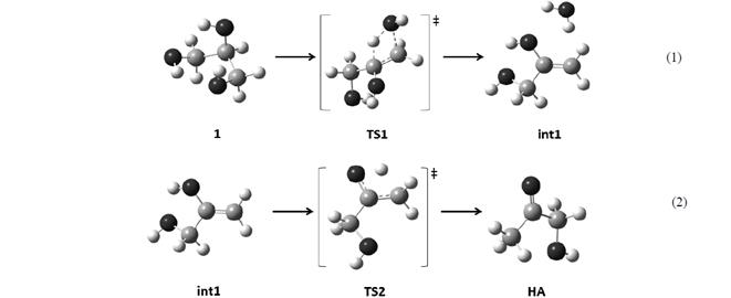 Eq. ( 1) shows that the first step of glycerol dehydration (structure 1) to form an enol intermediate (2,3-hydroxypropene, int1) proceeds through a four-membered cyclic transition state (TS1). This transition state structure is in agreement to that proposed at 0 K by Nimlos et al. [4]. At 533 K the Gibbs free energy barrier of the transition state is ΔG533,TS1 = 273.2 kJ mol-1, which means that this reaction (at gas phase) is expected to be rather slow. We also found that ΔH533,reaction = 21.3 kJ mol-1, indicating the endothermicity of this elementary reaction. Therefore, due to this and the activation energy obtained for TS1, it is possible to suggest that this reaction would be favored at high temperatures. This result agrees with the findings of Nimlos et al. [4] who suggested that this reaction is favored at temperatures near to those used for pyrolysis (around 873 K).