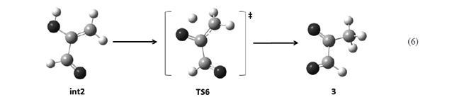 ( Eq. 5) involves a breaking of an H-H bond in a hydrogen molecule that requires a large amount of energy (ΔG533 = 406.7 kJ mol-1) to proceed. However, if there is a hydrogen molecule near to two electronegative atoms, it is expected that the electron interaction would decrease the dissociation energy compared to that required for the isolated hydrogen molecule. In the same context, it is also possible to suggest that the metal sites on the catalyst surface contribute to the dissociation of the hydrogen molecule. Therefore, this hydrogenation step would be favored through a catalytic effect. In this reaction, a six-membered cyclic transition state (TS5) structure was obtained, with an energy barrier of ΔG533,TS5 = 236.4 kJ mol-1, which is lower than that for four-membered cyclic transition states. This result is expected since six-membered cyclic structures have less geometric stress.