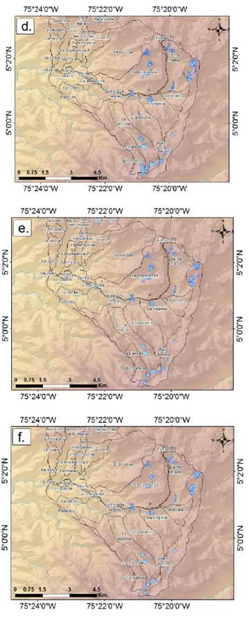 Figure 4: Multitemporal wetland analysis in the area studied, using SAR images: d). Sentinel-1 A, 2014, e). Sentinel 1 A, 2015, f). Sentinel 1 A, 2016.