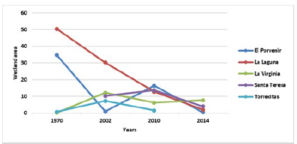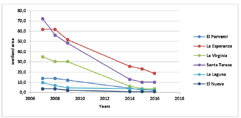 A temporal variation graph of the wetland area was created to corroborate the above observation (Graph 1). Linear regression was applied thereto, and one may observe that the La Laguna and El Porvenir sectors, reflect a significant decrease in water mirrors over time, while those of La Virginia are stable. In accordance with the equation applied, it may be determined that water mirror loss totals approximately one hectare per year, per property.