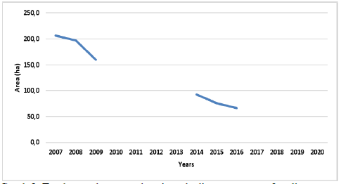 The annual total wetland areas of the wetlands studied were also calculated. Fig.4 shows the results and adjusted regression curve thereof. This figure reflects a significant loss in hectares of wetland in the area studied. In 2007, there were a total of 206.3 hectares of wetlands, which decreased to 66.2 hectares in 2016, a 67.9% loss in just nine years.