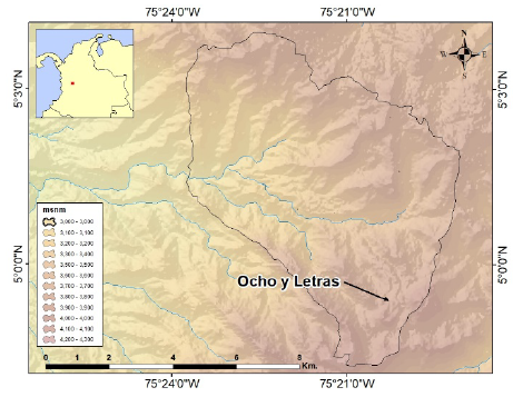 Figure 1: Study area location, Los Nevados National Park (PNNN), buffer zone in Colombia. Located in the upper part of the Chinchiná River basin in the department of Caldas.