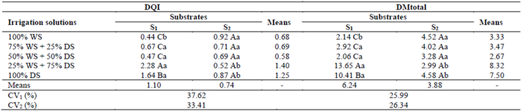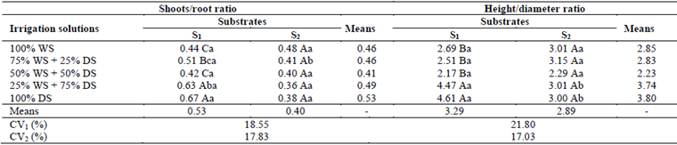 We can also observe higher mean values of root/shoots dry matter ratio and heigh/diameter ratio of ‘caraíbas’ seedlings grown on substrate S1 and fertigated with solutions of 25% WS + 75% DS and 100% DS, however did not differ on each other. In turn, the other irrigation solutions applied on the substrate S1 showed statistically equal mean values, while on the substrate S2 there is no statistical difference between irrigation solutions (Table 6).