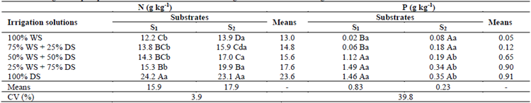 Means followed by the same lowercase letter in the rows and by the same capital letter in the columns do not differ at the 5% probability by Tukey test; N = nitrogen; P = phosphorus; WS = water supply; DS = domestic sewage effluent; S1 = 75% soil + 25% bovine manure; S2 = 75% soil + 25% coconut fiber; CV = coefficient of variation. Source: The Authors.