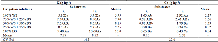Table 8: Means of potassium (K) and calcium (Ca) leaf contents in ‘caraíba’ seedlings under the effects of irrigation solutions and different substrates.
