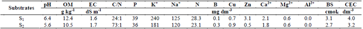 S1 = 75% soil + 25% bovine manure; S2 = 75% soil + 25% coconut fiber. pH - pH in water; OM - Soil Organic Matter; EC - electric conductivity in saturation extract; C/N - carbon and nitrogenous ratio; P - Phosphorus; K+ - Potassium; Na+ - Sodium; N - Nitrogen; B - Boron; Cu - Copper; Zn - Zinc; Ca2+ - Calcium; Mg2+ - Magnesium; Al2+ - Aluminum; BS - Base saturation; CEC - Cation exchange capacity (at pH 7.0). Source: The Authors.