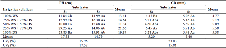 There was no difference in plant height and collar diameter when the seedlings were grown in substrate of 75% soil + 25% coconut fiber regardless of the residual water used (Table 3). The solutions irrigation of 25% WS +75% DS and 100% DS provided higher mean values of PH and CD. Although the averages were not statistically different it is observed that the application of 100% DS did not present increase in the ‘caraíba’ height which may have indicate that the seedlings showed resistance to absorb ions present in the concentration of the fertigation solution.